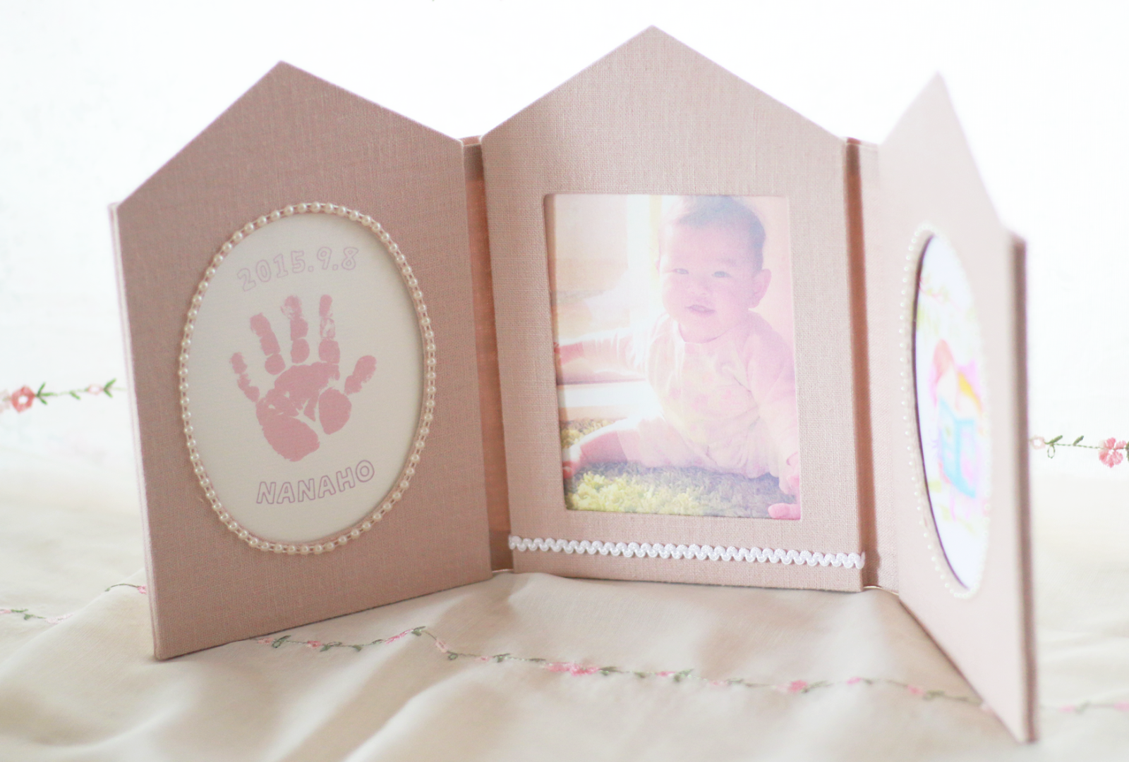 フォトスタンド…ですが、赤ちゃんの”写真”と”手形”を一緒に飾れるものを作りたいな〜とずっと考えていて、できたものなんです。