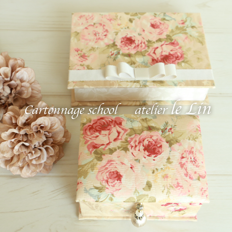 アンティークなフレンチスタイル(カルトナージュの基礎・ベーシック作品) 2017/6/20 ベーシック作品 ベーシック作品、フレンチスタイルです。 アンティークな雰囲気のお花柄が素敵なジャガード生地で。 お花を隠してしまうので、飾りはタッセルのみにしました。 お揃いでブックスタイルも。 ブックスタイルにはリボンが可愛い♪ 並べて撮ると楽しいです。