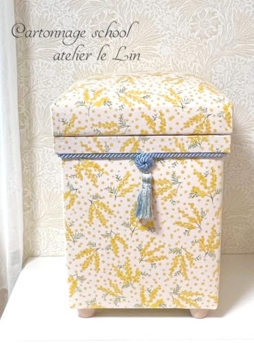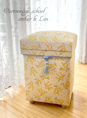 ミモザのお茶箱スツール(インテリア茶箱) 2025/10/29 お茶箱 Sさまのお茶箱作品のご紹介です。 ミモザ柄で、スツールを作られました。可愛い♡ 補色の水色のロープとタッセルで、好バランス♪^^ ダイニングに1つ置いておくと、何かと便利ですよ〜♪