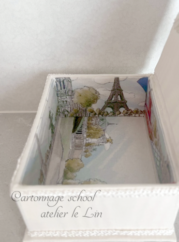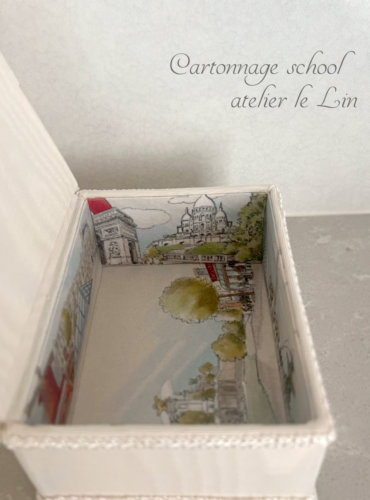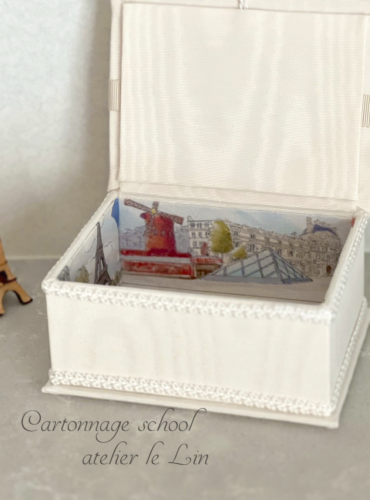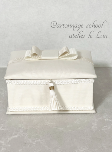 私自身カルトナージュを始めた頃、オフホワイトのモアレ生地でばかり作品をつくっていた時期がありました。懐かしいです♪