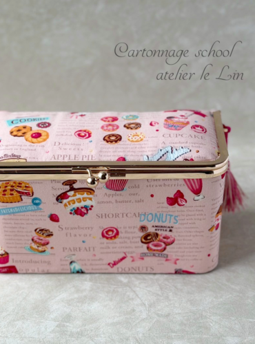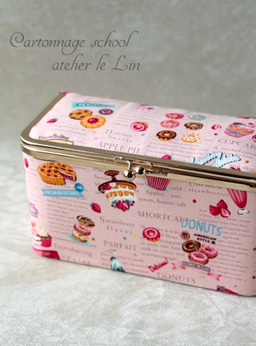 スイーツのがま口ボックス(生徒さまカルトナージュ作品) 2026/2/11 生徒さま作品 Iさまの作品です。 ピンクのスイーツ柄で、がま口ボックスを作られました。 ゴールド金具との相性◎ですね♡ ドーナツにケーキにクッキーに…美味しそう♪^^