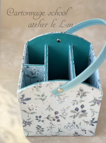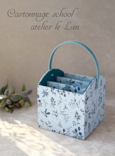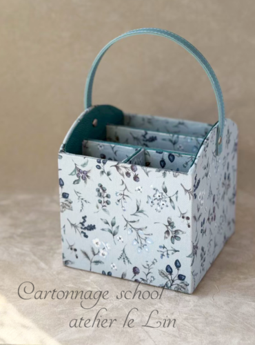 メガネスタンド(生徒さまカルトナージュ作品) 2026/4/23 生徒さま作品 Tさまの作品です。 ブルーのナチュラルなお花柄で、メガネスタンド。 リモコンスタンド然り、仕切りの調整などがなかなか難しい作品ですが、美しい仕上がりです♡ブルー系でまとめられました! 側面と持ち手、3つのカーブのバランスが可愛い作品です♪^^
