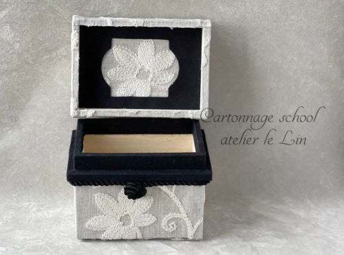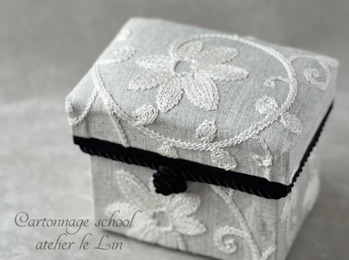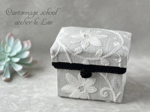 刺繍生地でミニ茶箱 2026/3/11 お茶箱, 生徒さま作品 Kさまの作品です。 鎌倉スワニーの刺繍生地で、ミニ茶箱♪ 大きめの柄を小さな作品に使うと、可愛いですよね♡^^ フタ裏にも、お花の刺繍部分をアレンジ。 優しい雰囲気のグレーの布ですが、黒を間に入れることでピリッと引き締まりました(*^^*)
