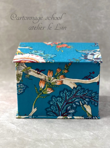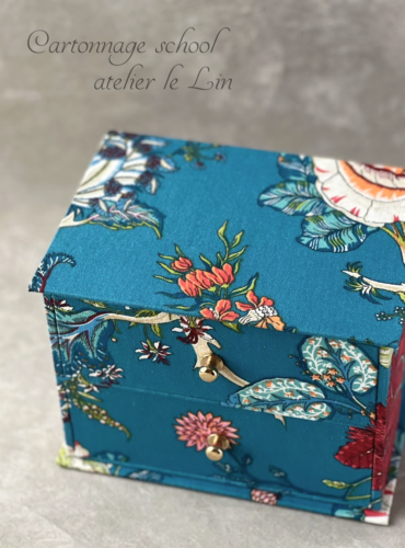 トワルドジュイのミニチェスト(生徒さまカルトナージュ作品) 2025/12/21 生徒さま作品 Tさまの作品、ミニチェストです。 パキッとした色使いの素敵な布は、 トワルドジュイ セイロン。 ハギレだったので布が足りず、引出し上段だけ柄合わせされたとのことなんですが、なんだか下の段もつながっているように見える(*^^*) トワルドジュイにこんなカラーの生地があったのですね。初めて見ました。 後ろ姿もぬかりなく、素敵です♡