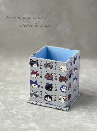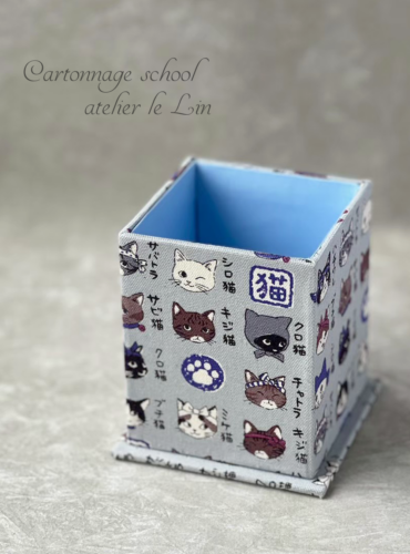 猫柄ペンスタンド(生徒さまカルトナージュ作品) 2026/1/29 生徒さま作品 Iさまの作品です。 KOKKAから出ている猫柄生地「猫模様図鑑」 和風の猫たちが可愛い…! お母様のために作られたそうです(*^^*) ちなみにこの生地、犬バージョンもあるようですよ〜♪