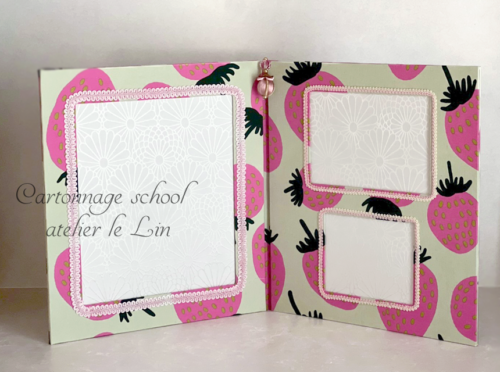 いちごのフォトフレーム(生徒さまカルトナージュ作品) 2026/3/13 生徒さま作品 Nさまの作品をご紹介します。 マリメッコのピンクのイチゴ柄で、2面のフォトスタンド。 入れたいものに合わせて、枠の大きさを決められました。 お孫ちゃんの手形と写真を入れられるそうです♡(*^^*) 中身を入れるとますます可愛いだろうなぁ♡ 2つに折りたためるので、飾らない時も省スペースです♪