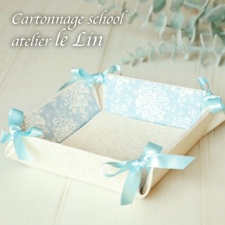 優しいブルーのリボントレー(生徒さまカルトナージュ作品) 2017/8/29 体験レッスン, 生徒さま作品 大阪・高槻のカルトナージュ教室 アトリエルランです。 ただいま体験レッスン受付中です。 Sさまの作品 リボントレーです。 Tildaのsummer picnicに オフホワイトのダマスク柄。 リボンも同じく淡いブルーを選ばれて、優しい雰囲気のリボントレーになりました(^^)