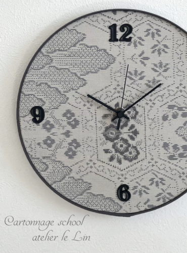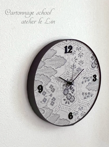 村山大島紬の壁掛け時計(生徒さまカルトナージュ作品) 2026/1/25 生徒さま作品 Yさまの作品です。 メインの亀甲柄は、村山大島紬のものなんだそうです。 数字は黒で4つだけ。針は小さめのものを選ばれました。 素敵な布が際立ちますね(^^) すべてモノトーンで統一。 いつものことながら…うっとり眺めてしまう美しさです♡